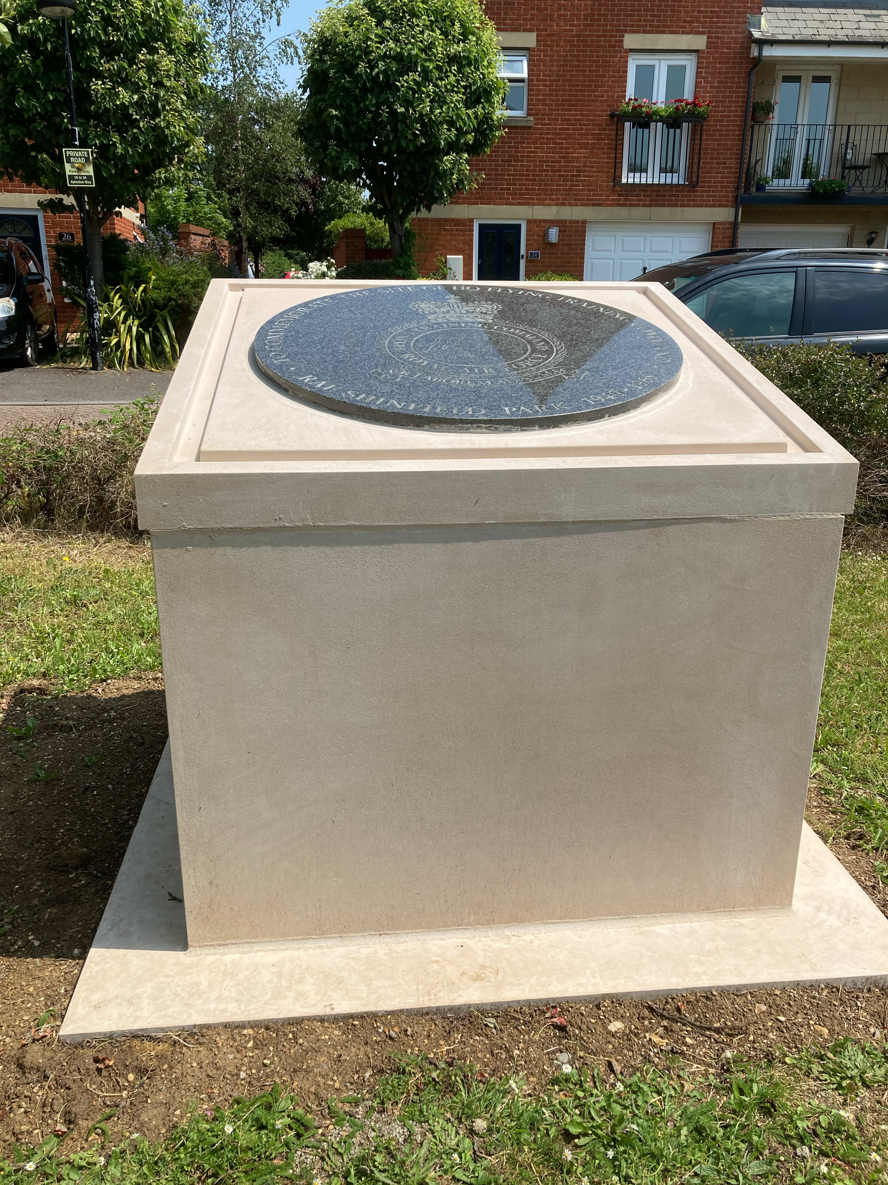 The original memorial was felt to be hard to see, being set flat at ground level and easily overgrown, so the plaque was raised on a stone plinth.