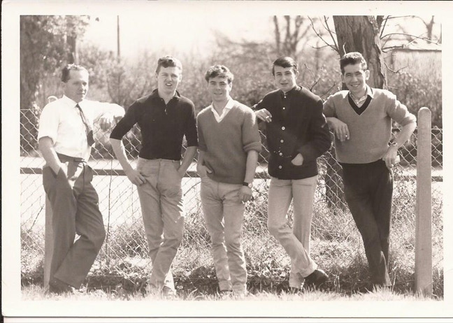 1964 - Fronting main road. L-R Jim Leonard, Bull(query), Taff Donovan, Mick Templeton, Charlie (chef)